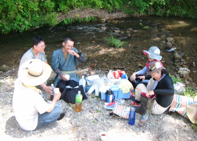 何処かな?と探せは、お友達と川のそばでお昼ご飯の最中でした。