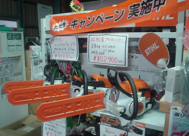 当店ではスチールチエンソーに力をいれ、できるだけ実物を触って頂いて購入して頂きたいと展示をしております。