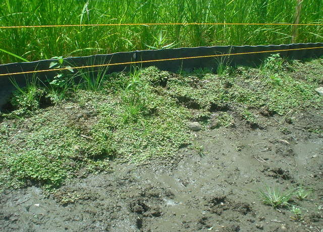 田んぼの中に猪が荒らした後が見えます。稲を踏み倒してメチャメチャにする害獣です。