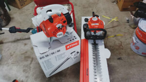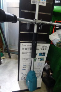左がブロアーで右がこれも今の時期の定番商品ですが、トリマーですね。生垣なんかを剪定するのに使われます。