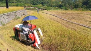 先日から始まったこちらの稲刈りは、雑草やひえに悩まされてたようですが無事に稲刈りを迎えました。