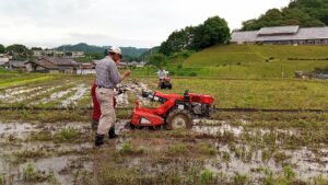 向こうに見えるのがもう一台の耕運機、この日は時間の関係もあって2台での作業です。耕運機が2台も田んぼで動くなんてのは、昭和の時代を思わせる光景ですよね(自分もさすがにその光景は、知りませんが・・・)